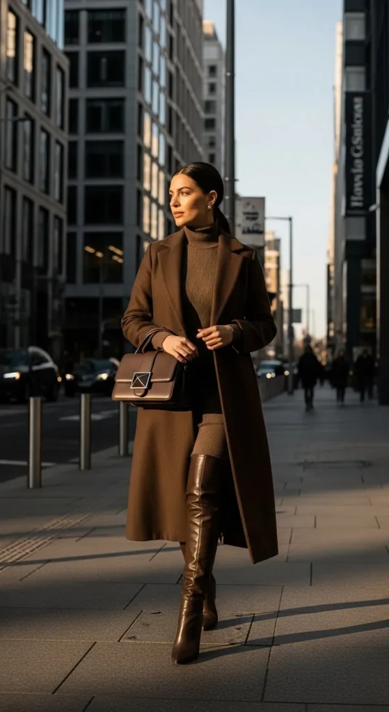 - Latte sweater + caramel skirt + chocolate boots