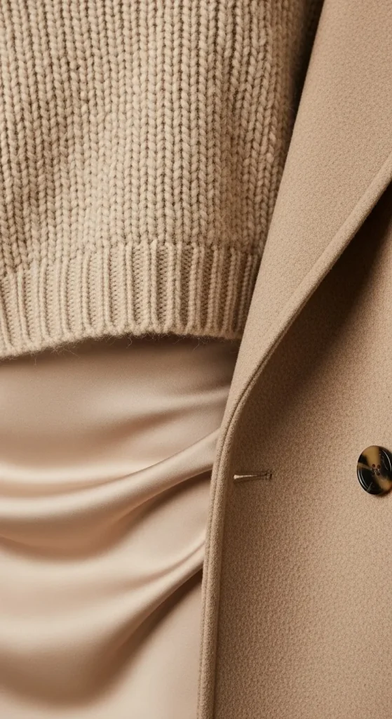 Imagine a cream wool coat layered over a silky cream blouse and tailored trousers — same colour, totally different feel.