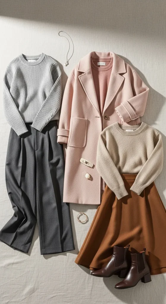 - Soft blush coat + dusty rose knit + deep rose trousers