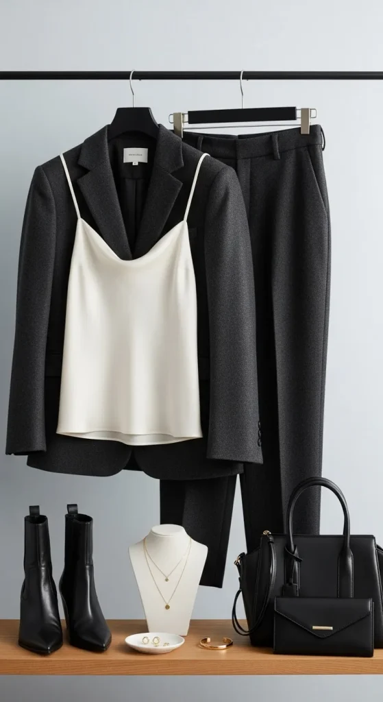 - Light grey top + charcoal trousers