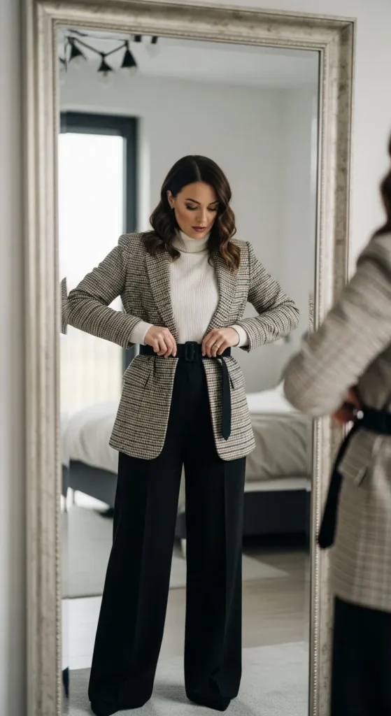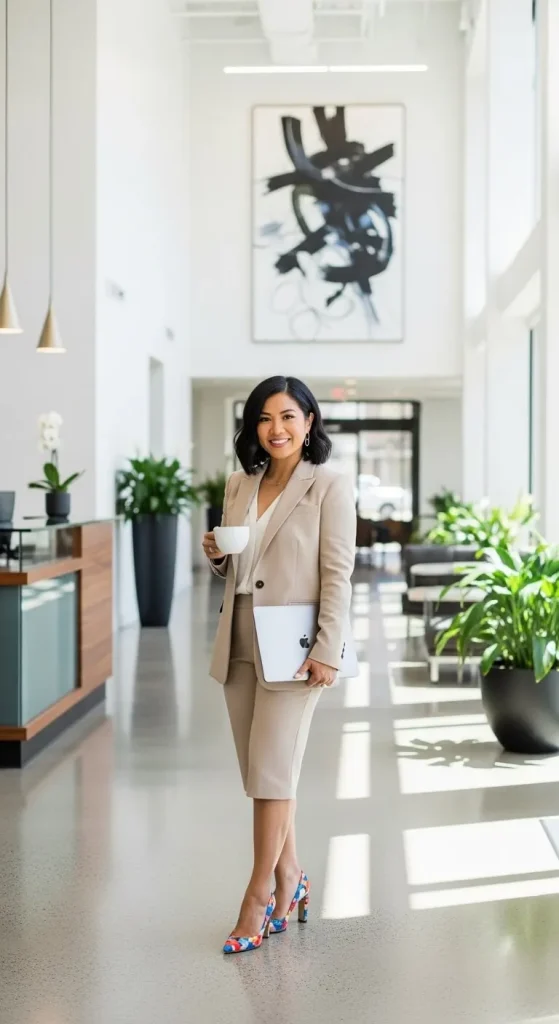 - For a softer touch, try pastel blouses under dark blazers or muted tones like dusty rose or sage.