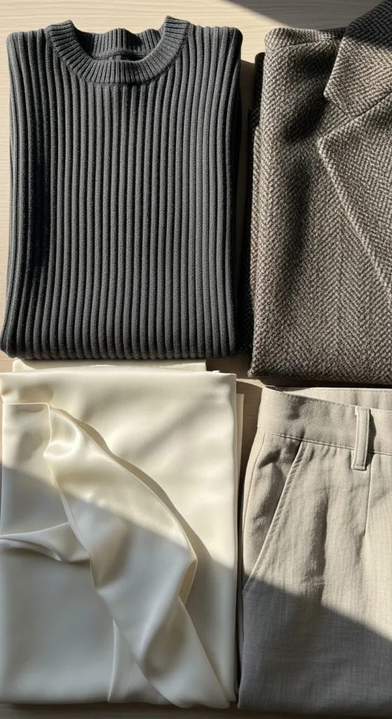 Textures matter too. Think ribbed knits, smooth satins, wool blends, and linen for summer.