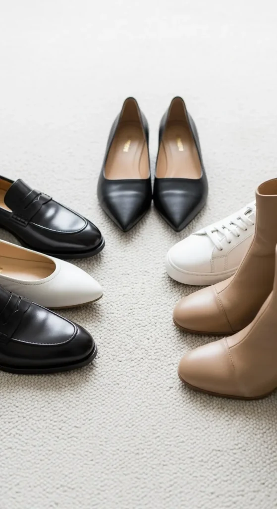 For corporate spaces, pointed flats or block heels polish your outfit instantly.