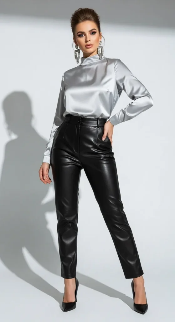 Leather pants can easily transition to a dressier look. To elevate your style, pair them with a chic blouse or statement top. Think satin blouses, silky camisoles, or even a structured shirt with bold colors or prints. This combination is perfect for a dinner date or a cocktail party.