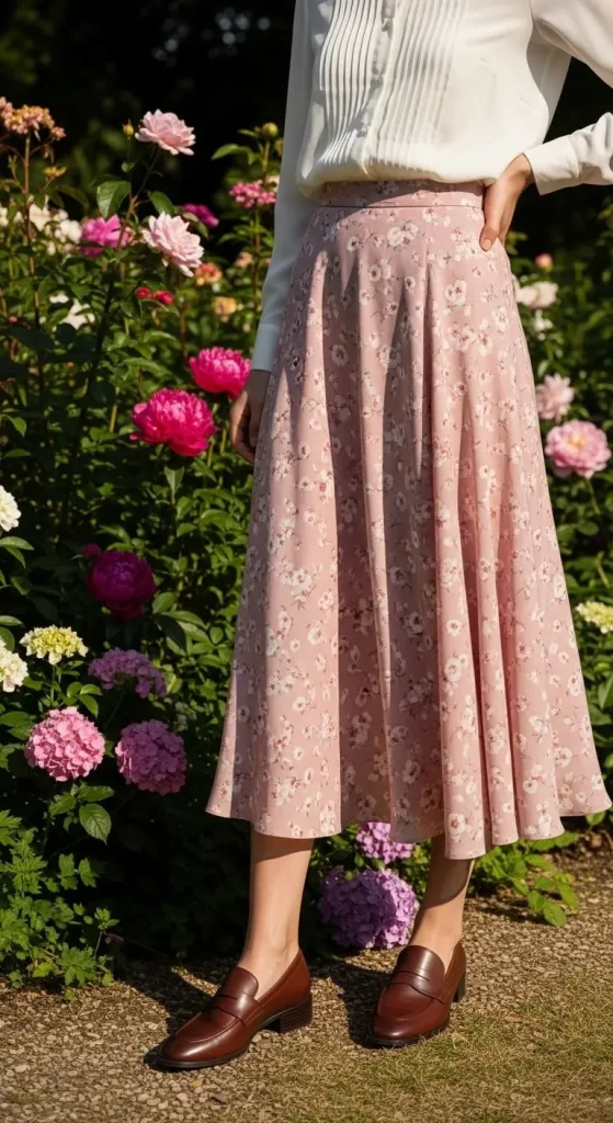 The contrast of structured shoes with soft, feminine clothing creates a perfect balance.