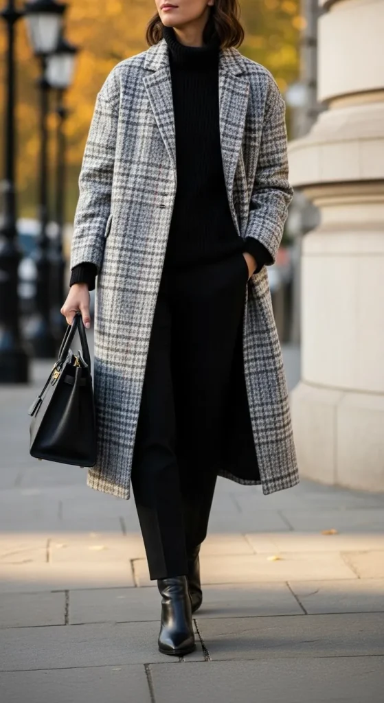 • Plaid coat over a monochrome outfit