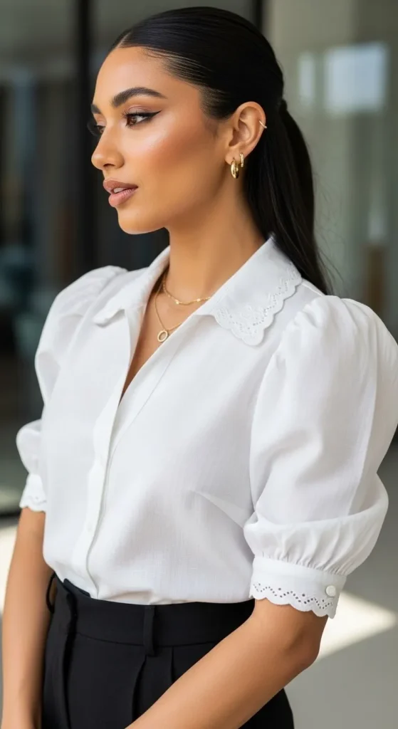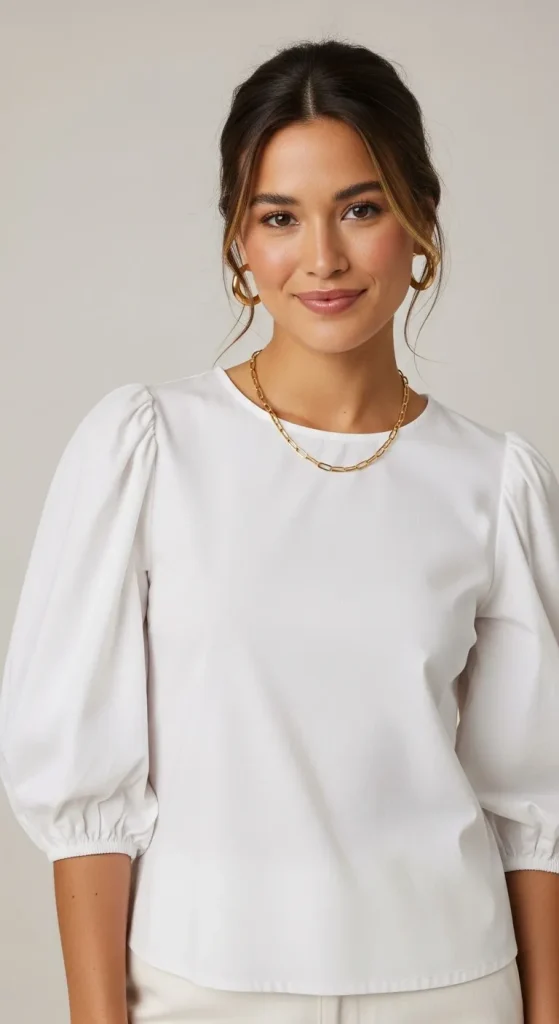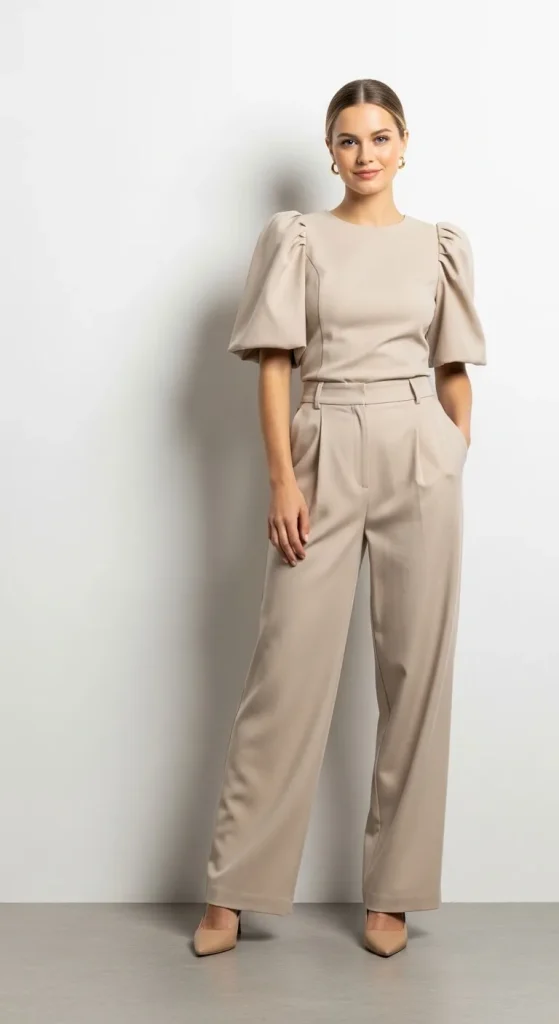 Statement sleeves already draw attention, so you don’t need wild patterns or neon shades to compete with them. Solid colors — white, beige, navy, black, or blush — make the sleeves feel elegant rather than exaggerated.