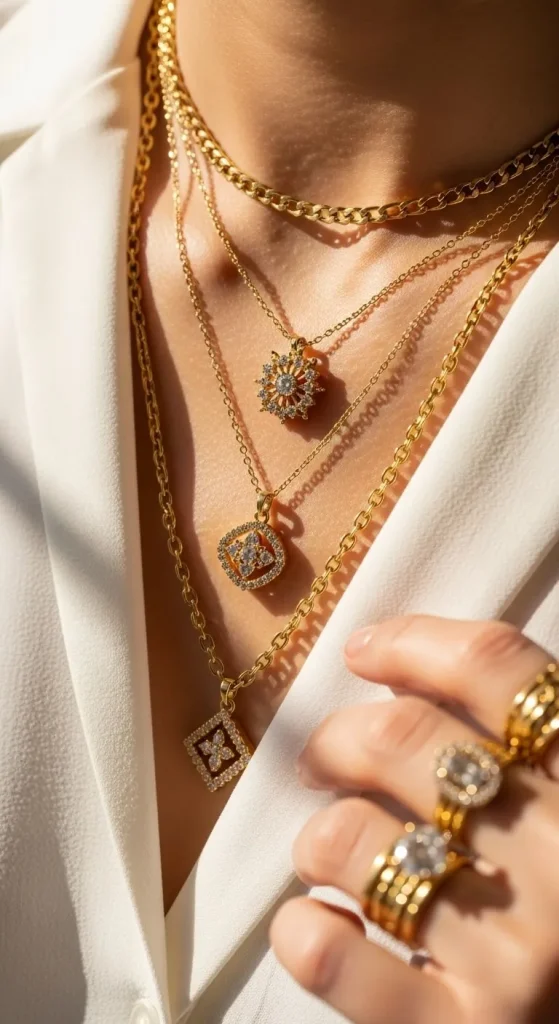- For a statement look, add pops of metallic—gold, silver, or rose gold.