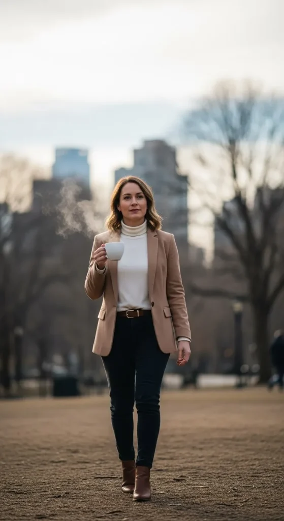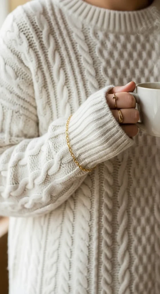 - A white turtleneck sweater or a cream oversized coat gives that warm, snowy-day glow.