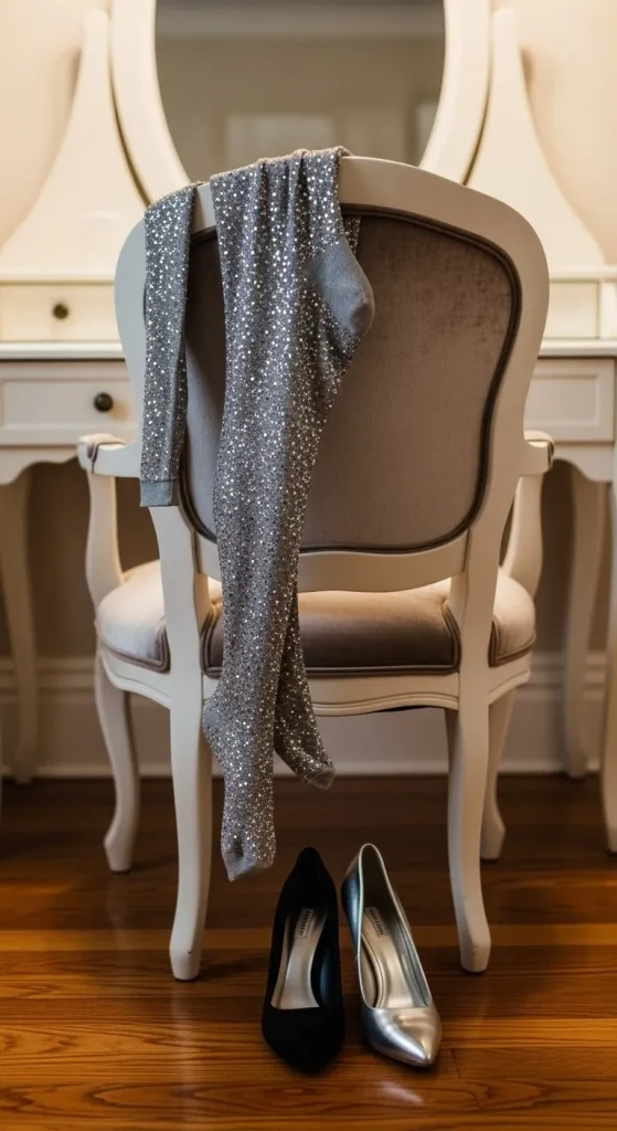 Glitter tights turn simple outfits into showstoppers. Wear under mini skirts or sweater dresses. They’re budget-friendly and reusable for other events. Choose thicker ones if it’s cold outside.