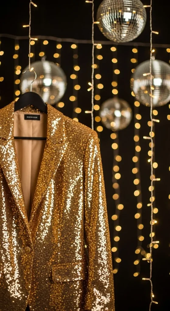 A gold blazer instantly looks festive. Wear it over jeans, dresses, or tailored trousers. Choose matte or sequined fabric depending on your style. For DIY sparkle, add small studs or glitter patches to an old blazer.