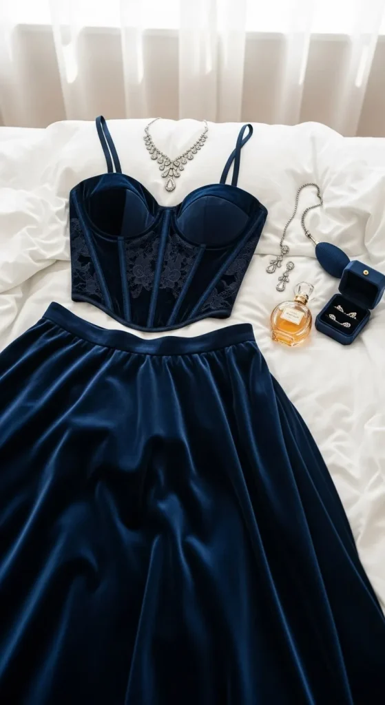 Corset tops add drama, and velvet brings texture. Together, they create a bold look. Add layered necklaces for detail. Make a corset from an old denim jacket for an affordable DIY version.