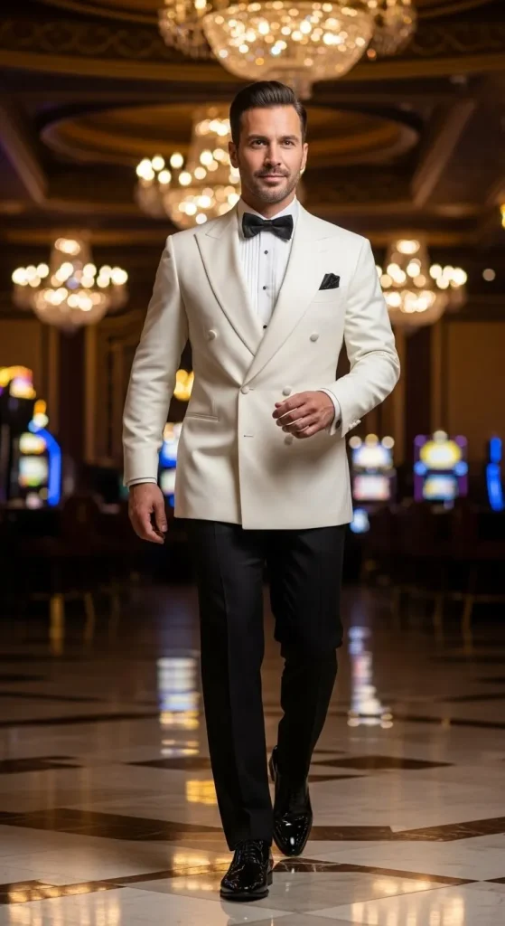 A white jacket gives off vintage James Bond energy. Match with a crisp shirt and black bow tie. Look for rental options to save money while keeping the luxury feel.