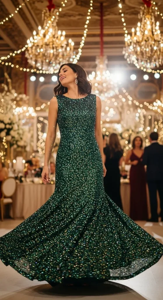 An emerald sequin gown brings life to any black-tie night. Keep accessories minimal and hair sleek. You can create a matching clutch by repurposing old sequined fabric into a foldover design.
