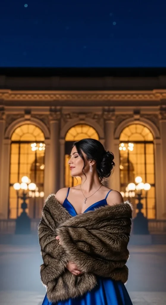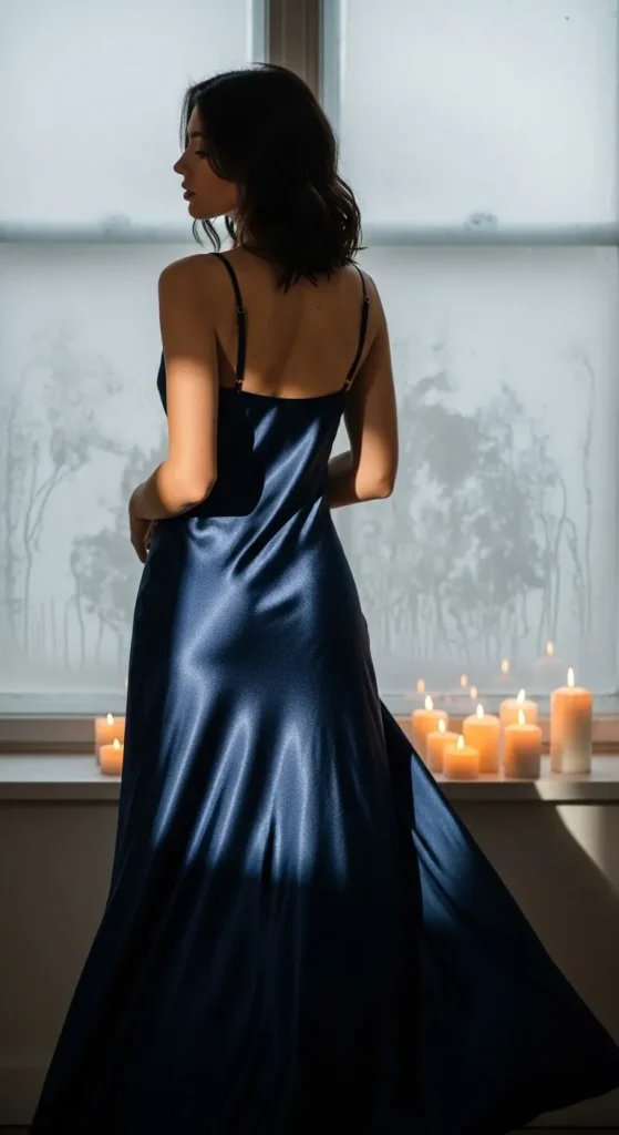A navy slip dress drapes beautifully under evening light. Pair it with a faux-fur shawl and strappy heels for instant sophistication. For a budget-friendly touch, layer thin gold chains or use drugstore body shimmer to highlight shoulders for a glowing effect.