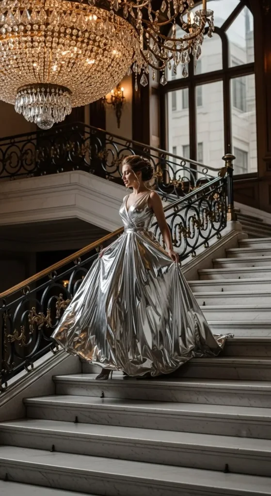 Go metallic for a modern twist. Silver gowns catch every sparkle in the room. Pair with crystal heels and minimal jewelry. Spray old shoes with silver glitter paint for a low-cost glam hack.