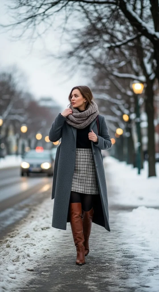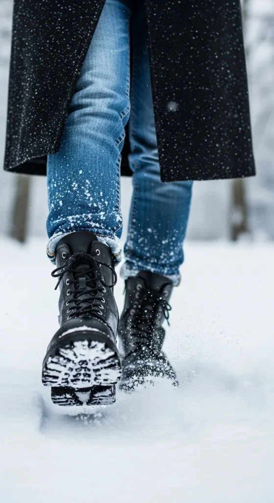 Combat boots give your outfit an edge. They’re practical, warm, and perfect for slippery sidewalks. Pair them with dresses, jeans, or skirts. Add thick socks and roll up your jeans for a relaxed finish.