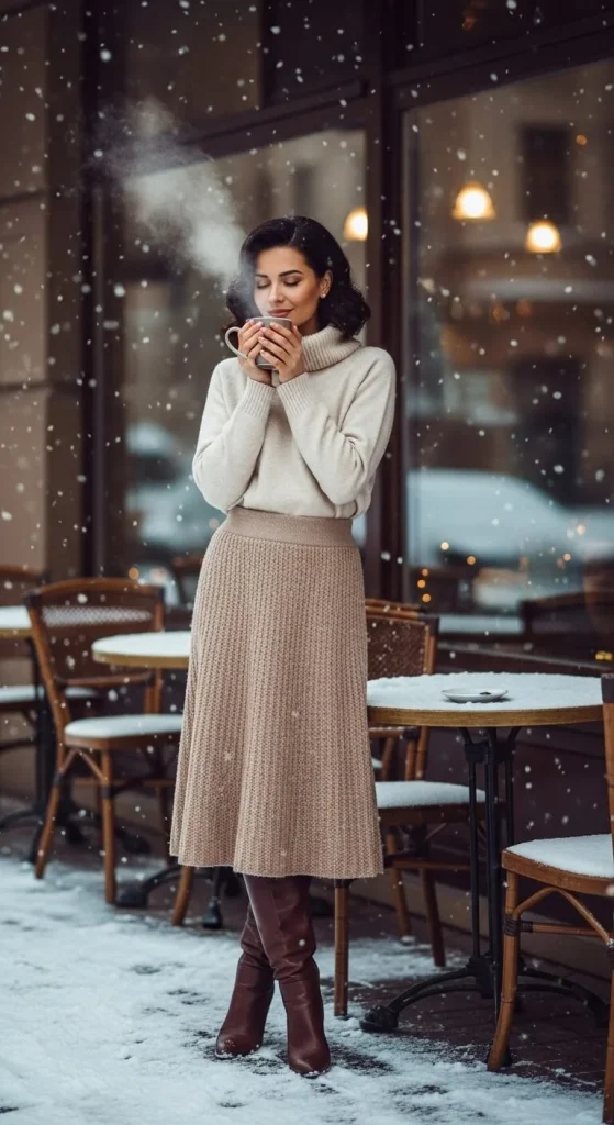 A knitted midi skirt keeps you cozy but polished. It moves beautifully and pairs with chunky sweaters. Try a ribbed texture in cream or mocha. Add a belt to define your waist and keep the outfit structured.